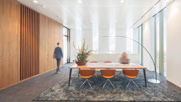 會(huì)議室的設(shè)計(jì):此次四周幾乎都是通透的,這樣的空間仿佛把人的壓力都抽走了一般,人的思緒有時(shí)候就如室外的風(fēng)一樣,讓人捉摸不定,但是當(dāng)我們有一顆穩(wěn)定的心之后,我們感受到的就是內(nèi)心的安靜,在此處給我們的就是這樣的感覺(jué),在這里仿佛什么都不在重要,思緒一下子變得輕盈起來(lái)。