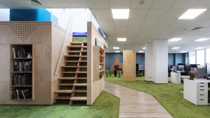 動線的設(shè)計:當我們沿著動線進入到內(nèi)部空間的時候,綠色的地毯給空間帶來了絲絲生機,地板走廊好似森林中延伸的彎曲的小路,指引著我們走進空間的深處,同時也為辦公空間帶來了一絲神秘感,讓我們對空間充滿了好奇,這樣的設(shè)計為我們勾勒出一處童話的世界。
