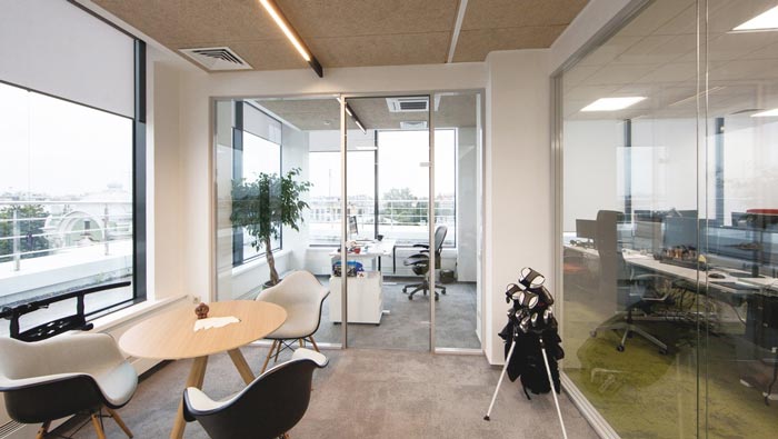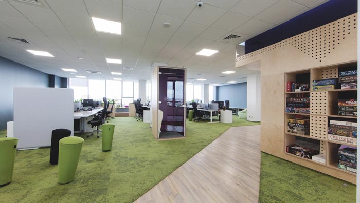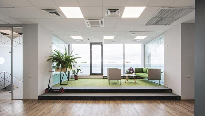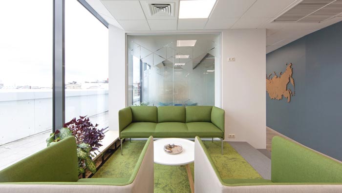 辦公區(qū)域的設(shè)計:在設(shè)計師看來辦公有時候就是在重復同一件事,這樣就很容易讓人有浮躁之心,在這樣的情況下,去除浮躁之心就是重中之重,這也是設(shè)計師采用綠色地毯的目的,設(shè)計師希望為空間營造一種童話的氛圍,讓員工在其中可以靜下心來認真的思考,理清自己的思路,如此浮躁之心自會消失。