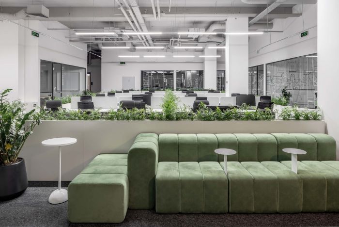 這是一家從事數(shù)字營(yíng)銷(xiāo)的廣告公司辦公室,有600平的面積。這個(gè)辦公室可以容納70名員工,功能規(guī)劃包括入口接待區(qū)、一間大會(huì)議室、兩間小會(huì)議室、一處大型開(kāi)放空間、帶有長(zhǎng)桌的餐廚休閑區(qū)、配有沙發(fā)的休息區(qū)、一間技術(shù)室和一間更衣室。