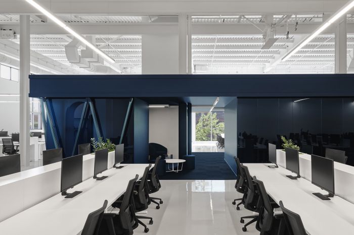 這是一個舊工廠改造成的辦公室,改造后共有兩層新的辦公空間,擁有1500方的面積設(shè)計師在空間中建造了一個體塊用來劃分空間,同時創(chuàng)造了一個休閑區(qū)域。