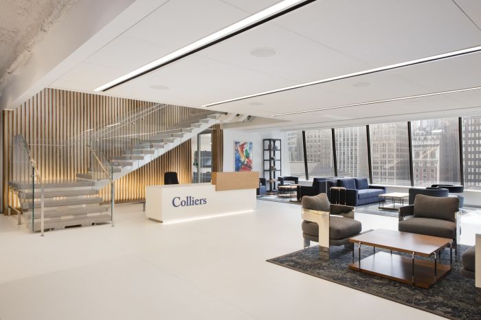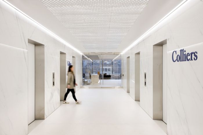 這是一個5500方的辦公室,整體空間寬敞明亮。整個空間設計都凸出體現(xiàn)了公司的品牌,同時還采用了極簡主義的色調和紋理。大理石面板從電梯大廳一直延伸到白色、淺灰色和藍色的輕盈背景中。