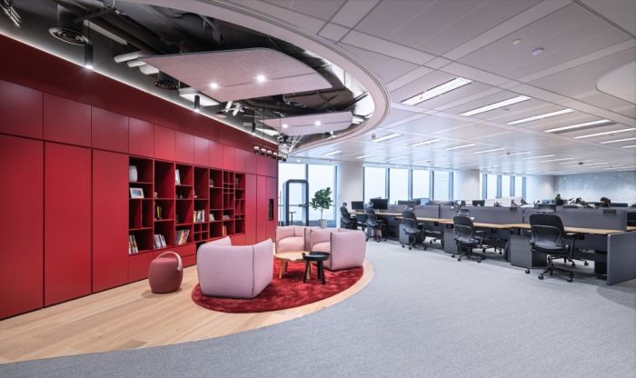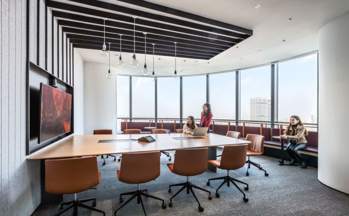 辦公室采用多種類型和形式的燈光,包括地面、吊燈和桌面燈光,以呈現(xiàn)明亮、充滿活力的工作文化。辦公室還運(yùn)用了中國傳統(tǒng)文化元素,如靈感來源于中國古代故事的地面和家具設(shè)計,以及以中國農(nóng)歷年為靈感的室內(nèi)裝飾。 辦公室還強(qiáng)調(diào)了與本地社區(qū)的聯(lián)系,通過標(biāo)志、裝飾和環(huán)境藝術(shù)作品等方式運(yùn)用了中國傳統(tǒng)文化的符號、顏色和字體。此外,辦公室還注重環(huán)境友好和員工福利,包括提供全景視野的餐廳和社交區(qū)域,以及可調(diào)節(jié)高度的辦公桌。