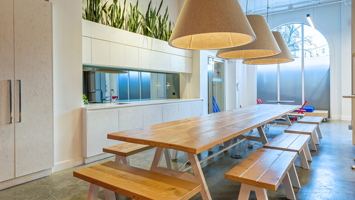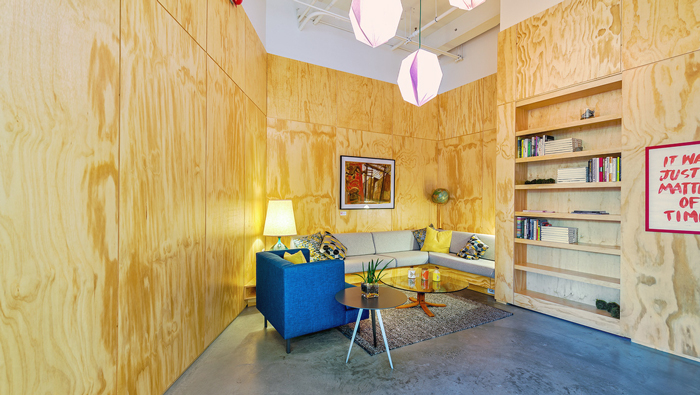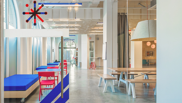 交流區(qū)域的設(shè)計:當(dāng)桌椅收攏起來之后,此處空間就擁有了更多的可能,這也是設(shè)計師設(shè)計的初衷,椅子被懸掛在墻體之上,儲藏柜按照層級依次向上,一方面可以在此處休息,另外一方面也為掛取椅子提供了保障,可折疊的桌子以此排列在儲藏柜的左側(cè),當(dāng)桌椅被收攏之后,被設(shè)計師巧妙的設(shè)計為空間的點綴物。