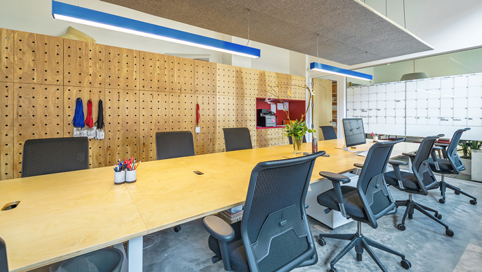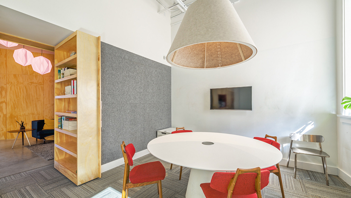 小型會議室的設(shè)計:我們首先看到的就是一個機(jī)關(guān)門,在外看是一個書架,往內(nèi)推開卻是另有一番天地,這也是設(shè)計師設(shè)計中的一點點小趣味,在設(shè)計師看來趣味是辦公中的調(diào)劑,設(shè)計師希望員工在辦公中不是一成不變的,而是幽默、活躍、有趣。