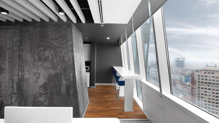 茶水間的設計:此處位于窗邊的空間,設計師這樣設計的目的,就是希望將此處的優(yōu)點完美的發(fā)揮出來,吧臺位于窗邊,在這里可以眺望整個城市,設計師希望員工在這里可以放飛自己,在這里可以暫時的忘記一切,在自然的景觀中,讓自己得以歸零并重新開始。