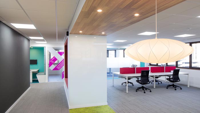 融合區(qū)域的設(shè)計(jì):從此處看交流區(qū)域與辦公區(qū)域相互交互在一起,這也是設(shè)計(jì)師希望看到的,在設(shè)計(jì)師看來由于空間面積有限,故此在設(shè)計(jì)的時候,要充分展示空間的多元化,要讓每一個空間都有多重屬性,這樣才能將每一個空間都合理的利用起來,以此將增加空間的多樣化,讓員工在辦公勞累的時候,可以有一個休息的場地。
