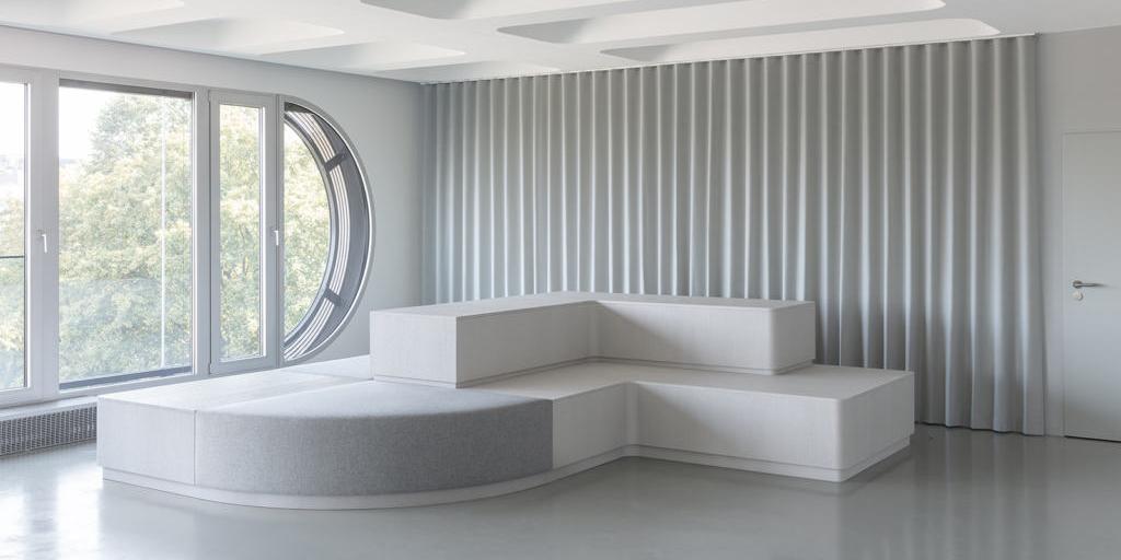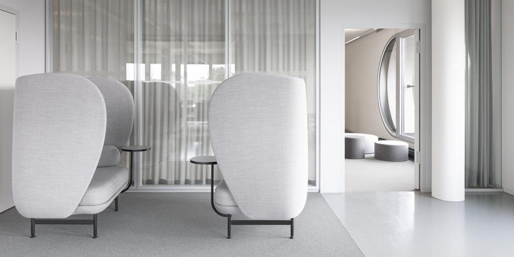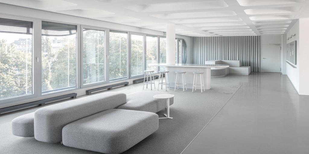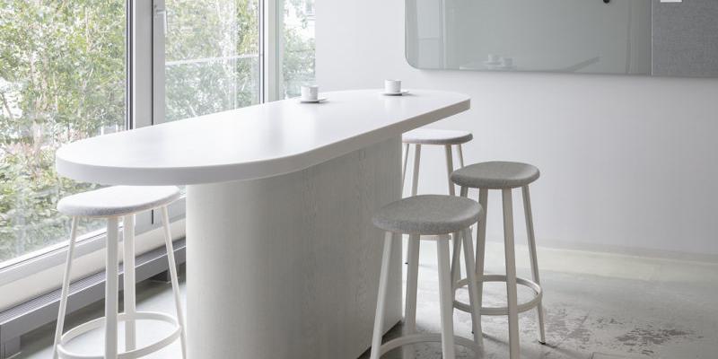 在接待處旁邊,還設(shè)立了一個(gè)等候區(qū),里面有高背沙發(fā);另外的椅子被分組,以便在大廳的另一部分提供一個(gè)更隱蔽的空間。這一部分的空間是四舍五入的技術(shù)移動(dòng),一個(gè)多功能的裝飾項(xiàng)目,可以用來(lái)展示一個(gè)變化范圍的鼓舞人心的技術(shù)展品。
