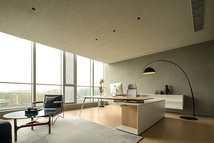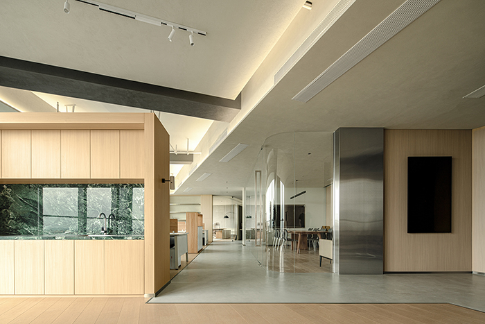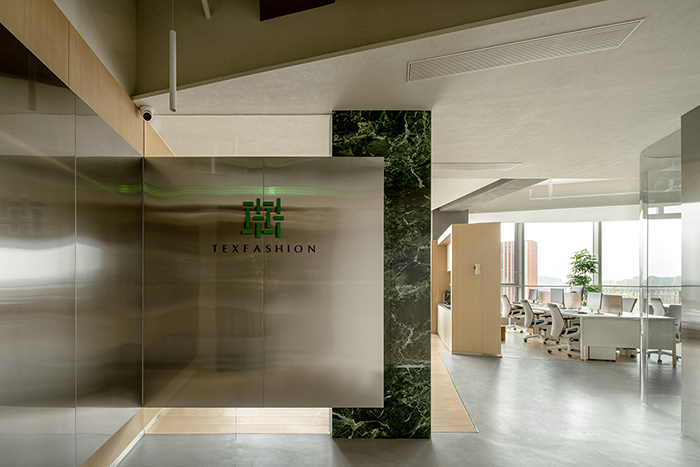 企業(yè)產(chǎn)品專注可持續(xù)性人工種植,主設(shè)計(jì)師對(duì)此表達(dá)為生態(tài)的感觀,提煉企業(yè)產(chǎn)品紗線最源頭的木材做為空間木飾面,同時(shí)希望在水泥墻面的深淺交錯(cuò)的映襯。