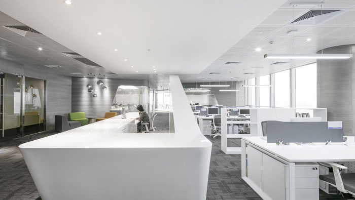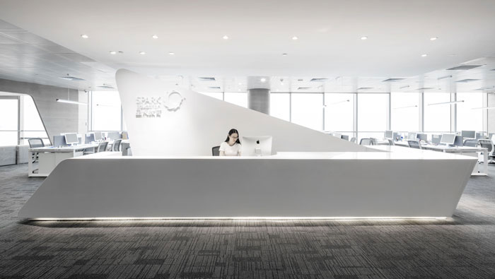 ? 前臺(tái)的設(shè)計(jì):前臺(tái)給人的感覺好像從天而降一般,這也是因?yàn)檎麄€(gè)空間呈開放式分布,設(shè)計(jì)師為了避免整個(gè)空間一覽無(wú)余,故此選用造型新穎、別致的前臺(tái),這樣的前臺(tái)除了承擔(dān)起接待的任務(wù),同時(shí)也要承擔(dān)阻隔的作用,在山尖處設(shè)計(jì)師將logo安置在此處,為企業(yè)的發(fā)展指明了方向。
