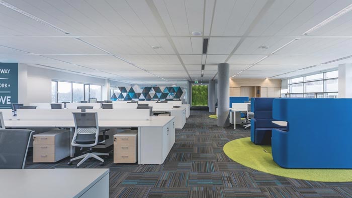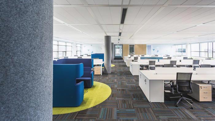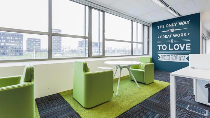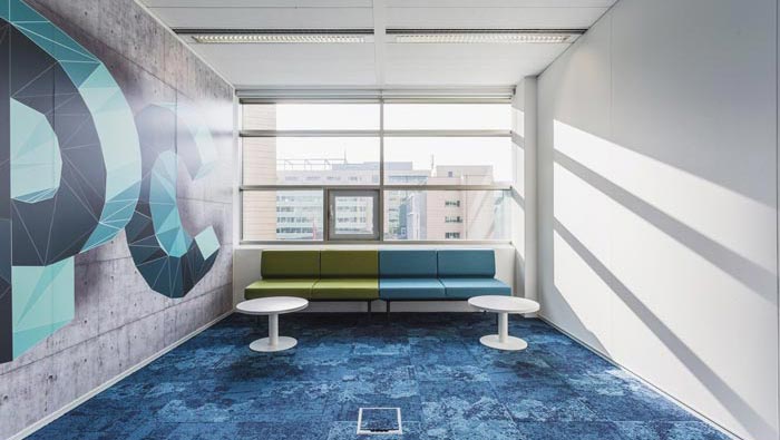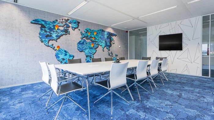 大辦公室的設(shè)計:設(shè)計師在設(shè)計的時候,將其安置在一個大的開放空間之中,設(shè)計師采用取中的設(shè)計原則,在設(shè)計師看來取中可以將思緒全部集中在會議區(qū)域,同時地毯設(shè)計師采用了類似海洋的顏色,以此寓意企業(yè)順風順水,同時這樣的設(shè)計將此處的向心力更加集中于中間部位,不會因為分散導(dǎo)致空間顯得空曠。