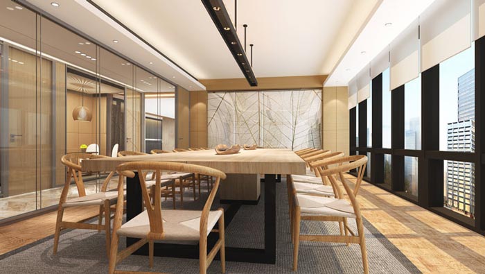 會議室的設(shè)計:此次給人的第一感覺好似有茶道的感覺,原因就是設(shè)計師與客戶都有一個共同的愛好,就是茶道,設(shè)計師在與客戶的交流中,也成為茶友,雙方都了解茶對人的作用,故此設(shè)計師以茶為起點,讓員工在這里的空間中,除了可以受到茶道的熏陶之外,還可以不斷提升自己的創(chuàng)新能力,因為茶讓人靜心、讓人心境空靈、去偽存真。