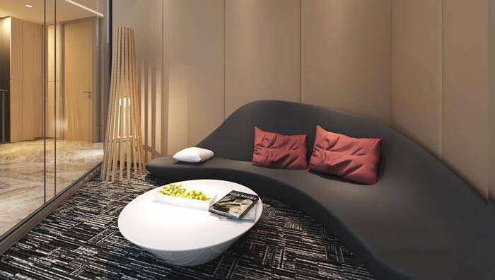 接待區(qū)域的設(shè)計:在設(shè)計中不是每一個空間都是完美的,就像此處空間本身就是一個菱形,這也就為設(shè)計增加了難度,設(shè)計師首先用木飾面對墻體進行裝飾,打消空間的棱角,其次就是定制的弧形接待沙發(fā),不管是擺放位置還是其本身的形態(tài),都有效的化解了空間本身的缺憾,讓空間趨于完美。
