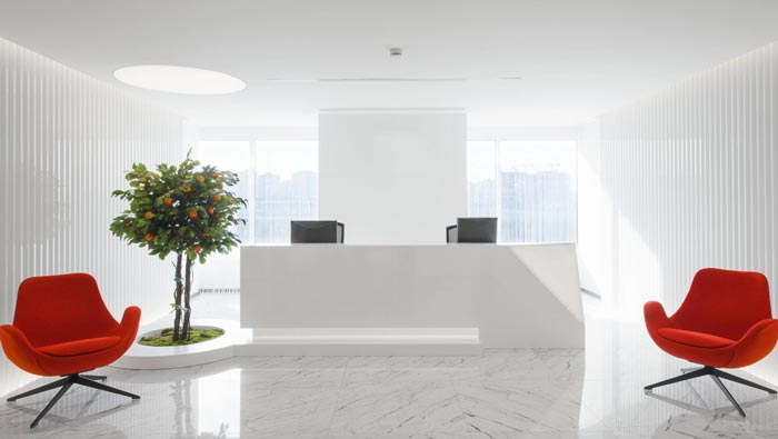 前臺(tái)的設(shè)計(jì):此處給人的第一感覺就是明亮、大氣,這也是設(shè)計(jì)師希望看到的,在設(shè)計(jì)師看來企業(yè)想要發(fā)展,就要在無時(shí)無刻之中注意企業(yè)的想象,設(shè)計(jì)師的想法就是從設(shè)計(jì)開始,就追求極致的簡約,給客戶留下一個(gè)不錯(cuò)的第一印象,仿真植物也為空間帶來勃勃生機(jī)。