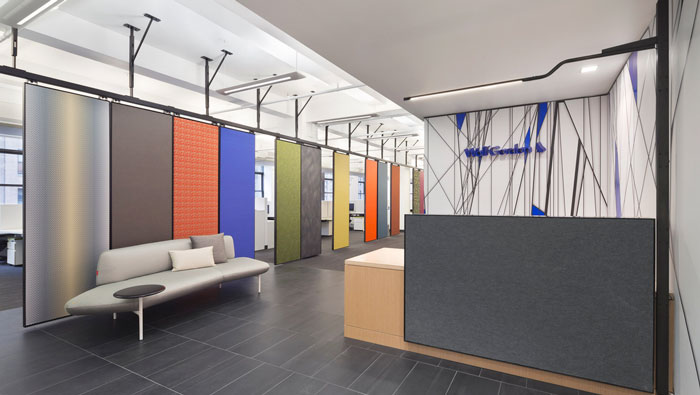 前臺的設(shè)計:前臺與辦公區(qū)域位于空間的左右兩側(cè),設(shè)計師在辦公室設(shè)計中,將隔斷打造成布匹的模樣懸掛在空間的中心區(qū)域,這樣一來客戶進(jìn)門后看到的就是一段段懸掛著的布匹,在顯示企業(yè)屬性的同時,也起到空間阻隔的作用,前臺縱橫加錯的絲線仿佛是織布的線條,這無不在顯示企業(yè)的屬性。