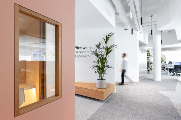 這是一個700方的辦公室,業(yè)主是一家從事醫(yī)藥行業(yè)的公司。設(shè)計師把工作區(qū)分為三個區(qū)域:一個安靜的區(qū)域,員工可以進(jìn)行個人工作;一個動態(tài)區(qū)域,員工可以單獨工作或者與同事互動;以及一個協(xié)作區(qū)域,團(tuán)隊可以在這里進(jìn)行會議,進(jìn)行團(tuán)隊討論。