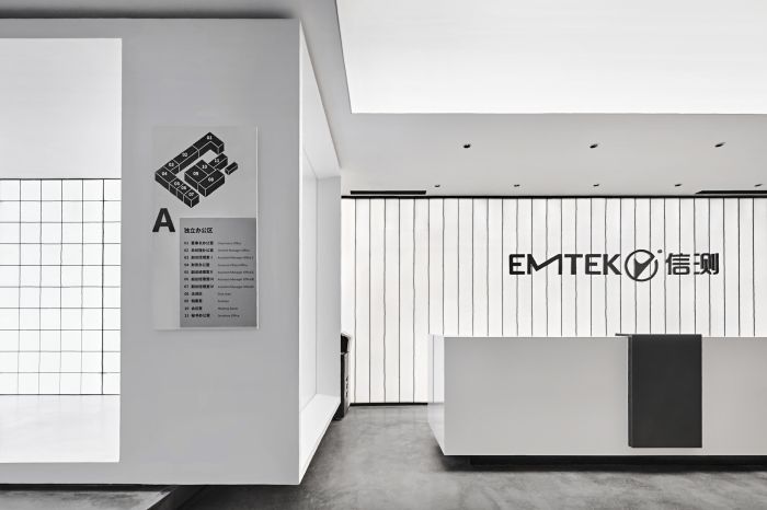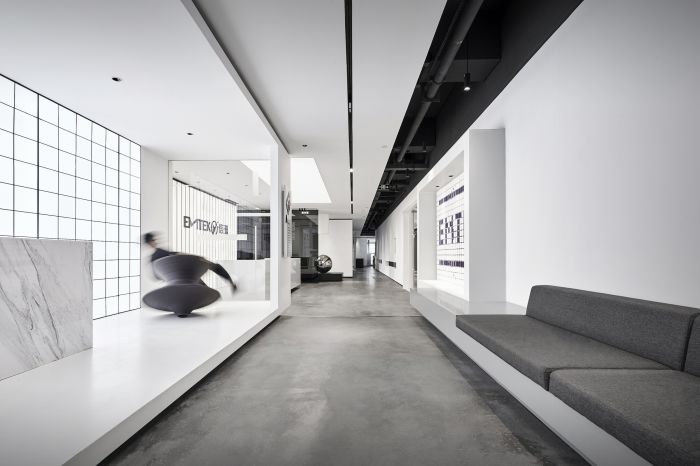 這是一個(gè)檢測(cè)科技公司辦公室的設(shè)計(jì),有1000方的面積。設(shè)計(jì)師在重新設(shè)計(jì)品牌空間時(shí),通過(guò)延續(xù)黑白灰的基調(diào),加入對(duì)立、沖突的元素,消解空間軸線(xiàn)的刻意規(guī)律感。