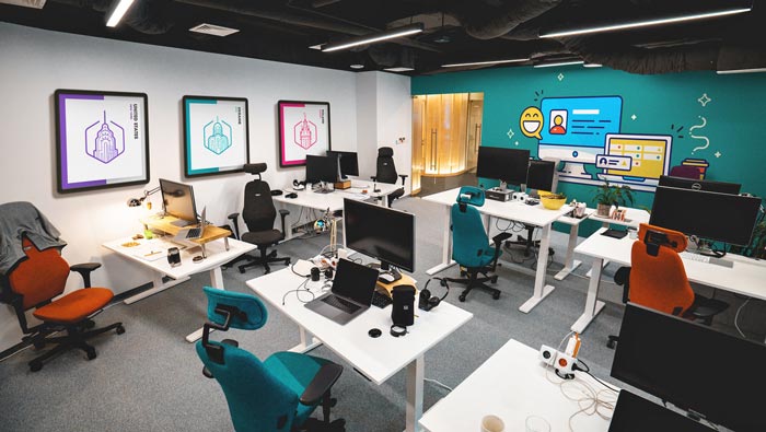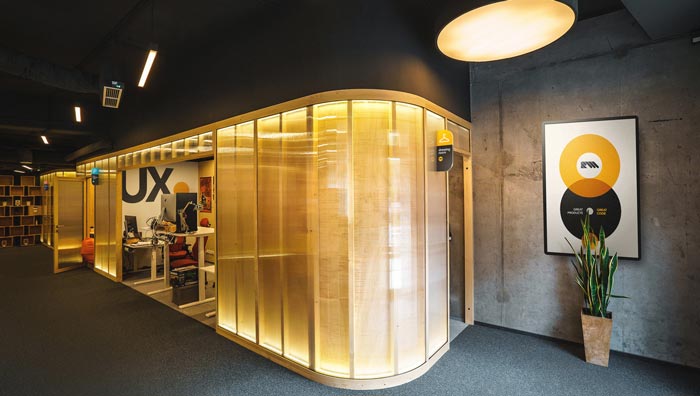 編碼室的設(shè)計(jì):內(nèi)外之間有一種別樣的感覺,外部空間以暗色為主,內(nèi)部空間以暖色為主,兩種色彩相互結(jié)合在一起,卻給我們展現(xiàn)了神奇的一面,暗色的頂與過道給程序員營(yíng)造了一個(gè)絕對(duì)安靜的空間氛圍,暖色系讓空間更加的溫馨,這樣的搭配主要就是希望給程序員一種家的感覺,消除程序員的煩躁與無(wú)聊。