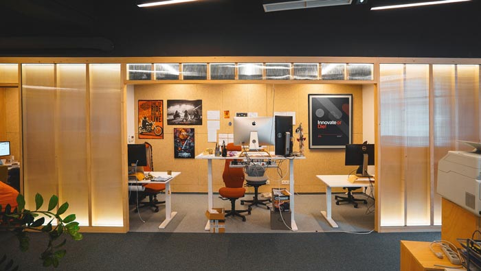 辦公場(chǎng)所的設(shè)計(jì):此處主要為后期測(cè)試與前端工作人員辦公的場(chǎng)所,在這里開放與私人相互結(jié)合在一起,開放的空間讓員工如一家人一樣,私人的設(shè)計(jì)讓員工擁有自己獨(dú)立的辦公空間,這樣做的目的就是給每一個(gè)員工留下獨(dú)立思考的空間,消除空間的弊端,讓辦公更加有趣。