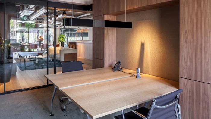 會(huì)議室的設(shè)計(jì):會(huì)議室與休息區(qū)域僅有一墻之隔,但是在設(shè)計(jì)中設(shè)計(jì)師對(duì)其進(jìn)行了隔音處理,目的就是希望讓空間中的每一個(gè)空間都不會(huì)相互影響,空間的格局大致分為內(nèi)外兩側(cè),外側(cè)主要是員工的辦公與休息場所,內(nèi)側(cè)主要就是會(huì)議與總經(jīng)理辦公室所處的區(qū)域。