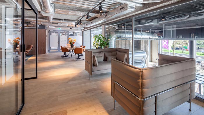 交流區(qū)域的設(shè)計(jì):此處位于窗邊,設(shè)計(jì)師在選擇的時(shí)候特意選用開放與私人一體的沙發(fā),這樣的好處就是在不影響空間的前提下,保證交流不會(huì)被打擾,交流的雙方坐在此處可以一邊欣賞外界風(fēng)景,可以一邊進(jìn)行商務(wù)交流,這樣的交談方式讓人感到新穎與貼切,讓交流在愉悅的氛圍下展開。