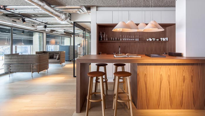 吧臺(tái)的設(shè)計(jì):設(shè)計(jì)師將吧臺(tái)與茶水間進(jìn)行了有機(jī)的結(jié)合,其目的就是希望給空間更多的屬性,設(shè)計(jì)師要做的就是將每一個(gè)區(qū)域進(jìn)行融合,在設(shè)計(jì)師看來由于空間的面積有限,故此在設(shè)計(jì)中一定要考慮到各個(gè)方面的融合,也只有如此才能將空間利用到最大化。