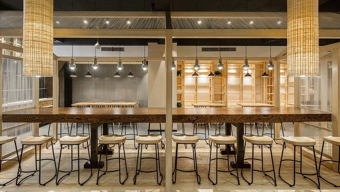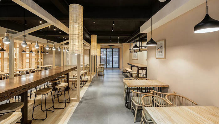 特色面館大眾區(qū)設(shè)計(jì):超長(zhǎng)的餐桌、獨(dú)立的餐椅讓空間的容納能力進(jìn)一步提升,空間的容納能力提升但卻并不顯得擁擠,這是設(shè)計(jì)師為每個(gè)人都預(yù)留了足夠的活動(dòng)空間。
