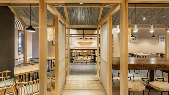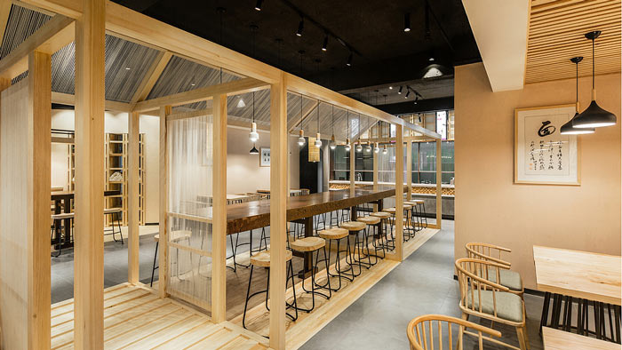 特色面館中間區(qū)域設(shè)計(jì):中間區(qū)域由木制的框架構(gòu)成,設(shè)計(jì)師在整體框架之下,又將空間分成幾個(gè)不同的區(qū)域,這樣做的目的就是希望將空間進(jìn)行有效的劃分。