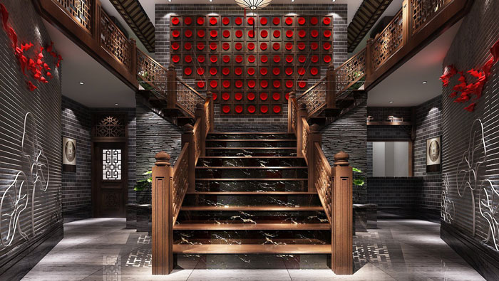 中式川菜館樓梯裝修設(shè)計:一分為二的木制樓梯,相信現(xiàn)在很少見到,這樣的樓梯一來是為了更好的分流,二來是起到連接空間的作用,客戶在這里感受到濃郁的古式風(fēng)格。