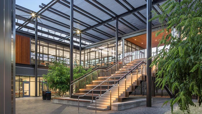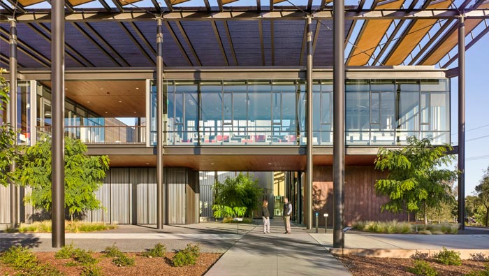 辦公樓進(jìn)門(mén)區(qū)域的設(shè)計(jì):頂部折疊的設(shè)計(jì),可以將強(qiáng)光擋在遮光板之外,讓光經(jīng)過(guò)阻擋后變?yōu)槿峁?,這樣的轉(zhuǎn)換讓人可以免受強(qiáng)光的照射,同時(shí)遮光板也有吸收太陽(yáng)能的作用,經(jīng)過(guò)專(zhuān)業(yè)設(shè)備的轉(zhuǎn)換,為日常照明、工作提供了免費(fèi)的電源,設(shè)計(jì)與設(shè)計(jì)之間環(huán)環(huán)相扣,讓廠房自身的節(jié)能趨于完美。