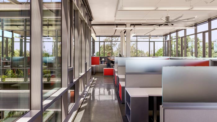 辦公區(qū)域的設(shè)計(jì):通過(guò)上圖可以看出此處空間,是一個(gè)半開(kāi)放、半封閉的辦公空間,設(shè)計(jì)師這樣設(shè)計(jì)的目的就是希望,給每一個(gè)員工留下足夠的私人空間,辦公區(qū)域四周都是透明窗戶(hù),這樣可以保證陽(yáng)光可以時(shí)時(shí)照入室內(nèi),墻沿處設(shè)計(jì)師采用了進(jìn)門(mén)的折疊遮光板,將強(qiáng)光變?yōu)槿峁饨o每一個(gè)人溫暖的感受。