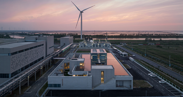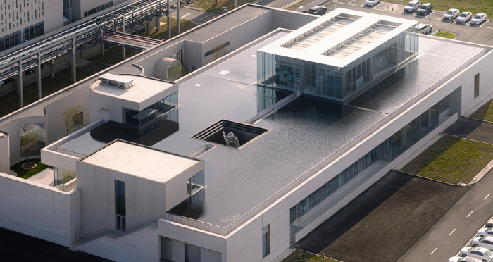 這是一個新能源材料行業(yè)的工業(yè)廠區(qū)的設(shè)計(jì)案例。廠區(qū)建筑以水為主題,水上的漣漪仿佛叩響生命與物質(zhì)的存在邊界。生產(chǎn)車間的發(fā)酵恒溫水排走之前,在辦公區(qū)屋頂匯成淺池。