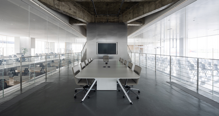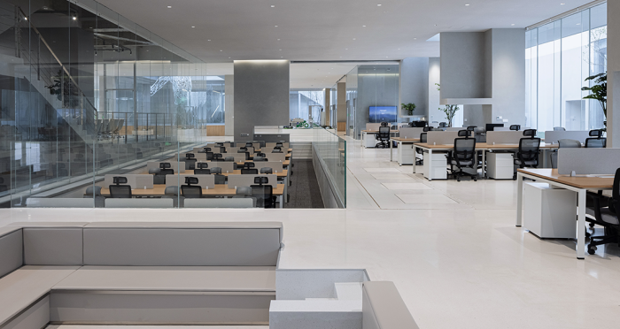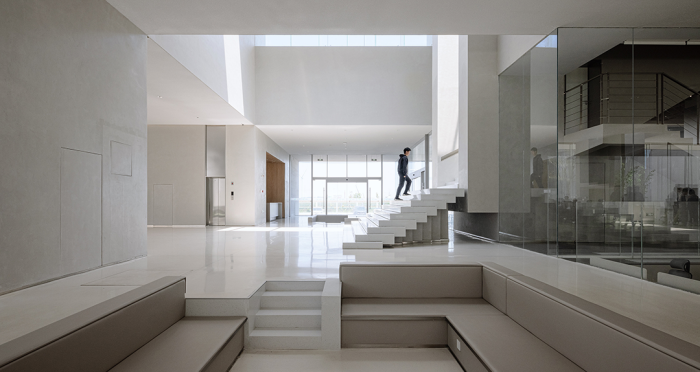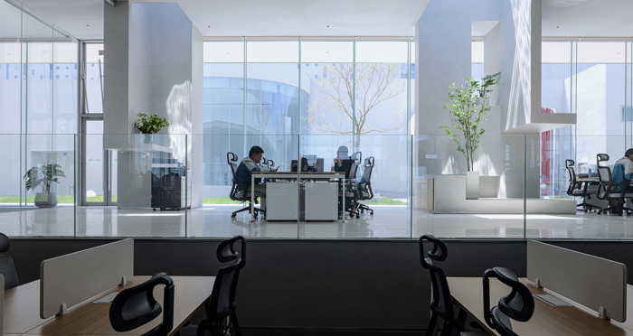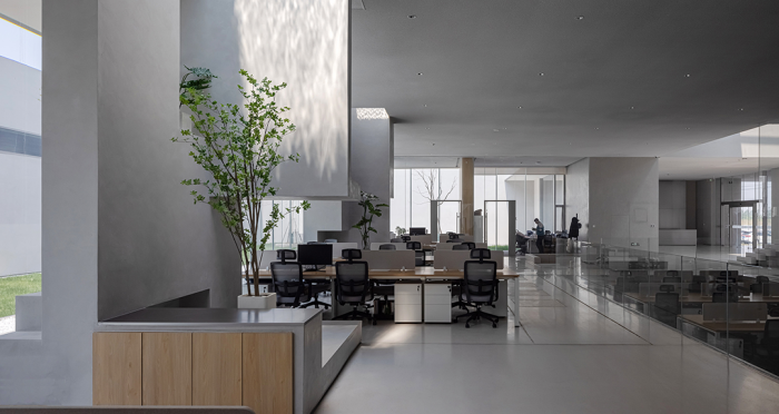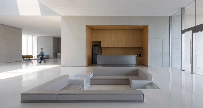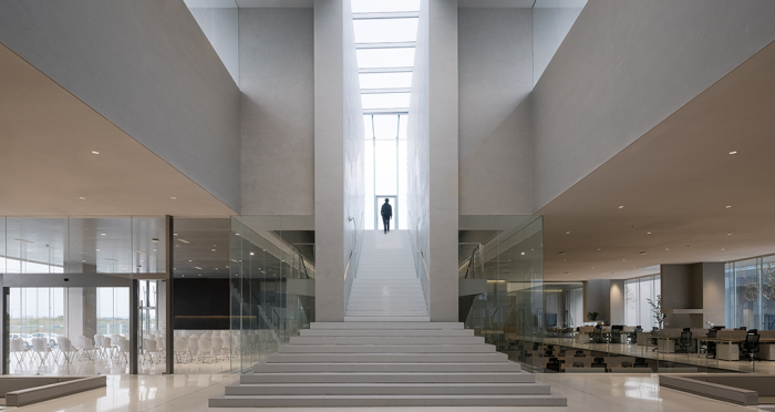 展廳、會客廳和行政會議室凸出水面,辦公區(qū)、會議室、員工食堂、廚房和多功能廳等大部分空間沉在水面以下,墻柱等構(gòu)筑物和房間像細(xì)胞器一樣自由分布,具有極好的漫射采光。