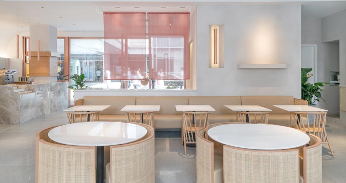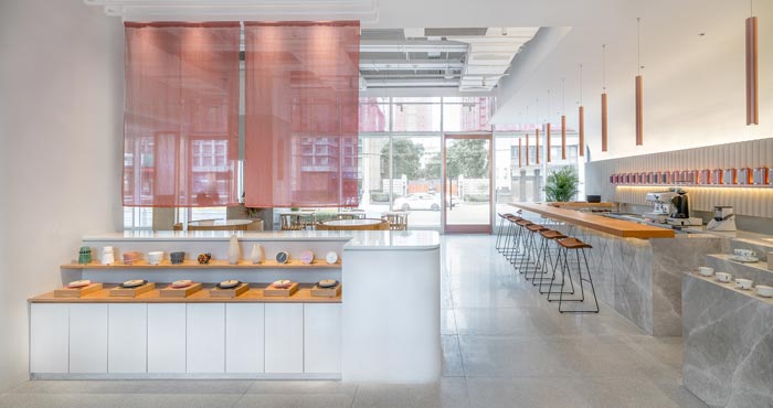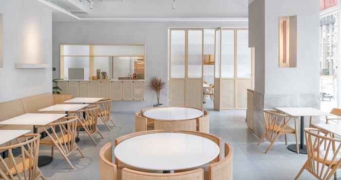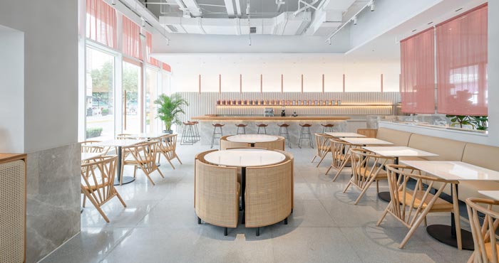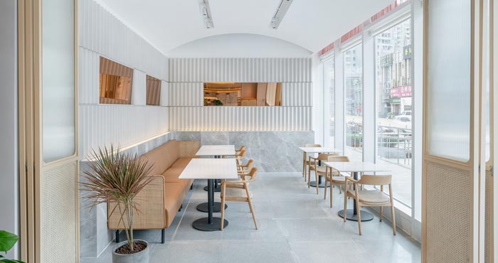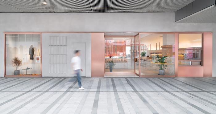 本次為茶餐廳設(shè)計項目,茶餐廳位于一個商業(yè)綜合體的室外一層,設(shè)計師希望創(chuàng)建一個舒緩的流線,引導(dǎo)人進(jìn)入到一個愜意的氛圍空間。