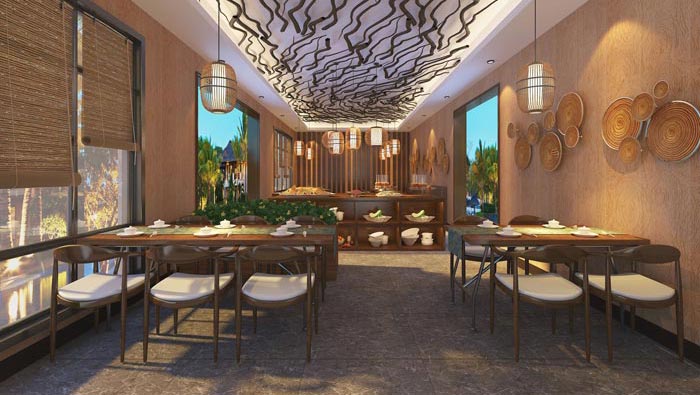 餐廳的設(shè)計(jì):當(dāng)顧客進(jìn)入酒店之后,首先迫切希望的一定是飽餐一頓,這也是人最初的需求,設(shè)計(jì)師在餐廳的設(shè)計(jì)中,將餐廳的位置定于酒店的中央,也就是滿園花色的正中央,讓顧客在進(jìn)餐的時(shí)候,可以隨時(shí)隨刻欣賞到美麗的景色,秀色可餐也不過如此呀。