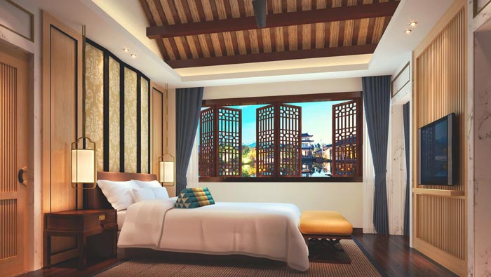 C類客房的設(shè)計(jì):此處的內(nèi)部搭配相對簡潔一些,這是由于外部景觀所決定的,相信大家透過窗戶可以看到對面的靈臺樓閣,設(shè)計(jì)師在此處希望讓客戶感受到的正是外部的景色,客戶站在窗邊、坐在床上、躺在床上,以不同的姿勢去欣賞外部的風(fēng)景,得到的體驗(yàn)也是完全不同的。