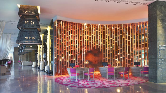 前臺(tái)的設(shè)計(jì):當(dāng)顧客進(jìn)入空間之后,首先感受到的就是當(dāng)?shù)氐娘L(fēng)土人情,這也是設(shè)計(jì)師希望看到的場(chǎng)景,在設(shè)計(jì)師看來設(shè)計(jì)是要因地制宜的,在設(shè)計(jì)中設(shè)計(jì)師在當(dāng)?shù)剡M(jìn)行了多次的調(diào)研,目的就是要尋求當(dāng)?shù)鼐哂写硇缘慕ㄖc文化,并將其縮小后融入空間之中。
