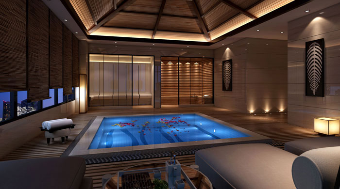 SPA與浴池的設(shè)計(jì),設(shè)計(jì)師根據(jù)會(huì)所優(yōu)越的地理位置,通過(guò)頂部的設(shè)計(jì)來(lái)收集月光,讓人在享受的同時(shí)可以感受到月光的輕柔。