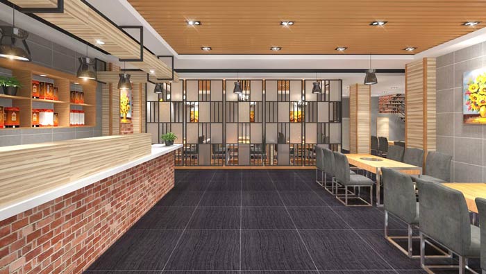 本次魚火鍋店裝修設(shè)計方案講解到此結(jié)束,設(shè)計師在本次火鍋店設(shè)計中,空間地面采用黑色仿古磚,墻面采用三種色彩的材質(zhì)與小紅磚,讓客戶仿佛在記憶中中老房子里就餐。