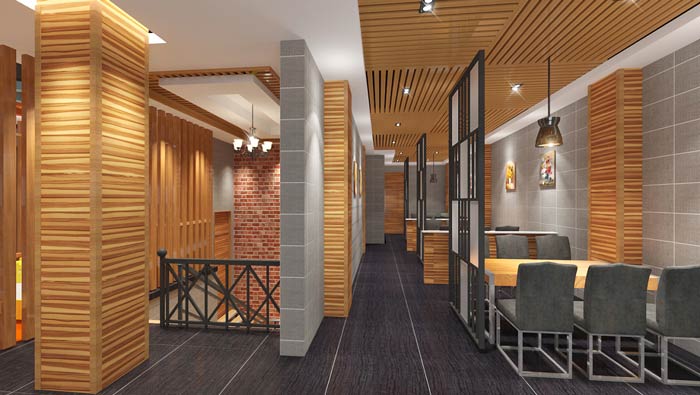 本次為魚火鍋店裝修設(shè)計方案,在實(shí)地考察的時候,了解到整個空間是兩層建筑,在設(shè)計中一樓主要由前臺、開放式就餐區(qū)構(gòu)成,二樓主要由包間、以及兒童玩耍區(qū)構(gòu)成,空間地面采用黑色仿古磚,墻面采用三種色彩的材質(zhì)與小紅磚,讓客戶仿佛在記憶中中老房子里就餐。