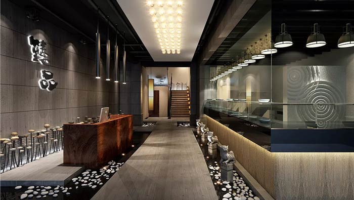 肥?;疱伒昵芭_(tái)設(shè)計(jì):整個(gè)空間分為左、中、右,左邊為前臺(tái)接待,右邊為透明廚房,中間為過(guò)道,前臺(tái)與廚房安置在對(duì)立面,是為了讓客戶吃的放心與安心。