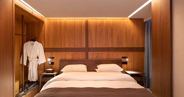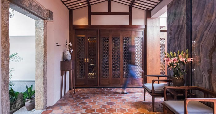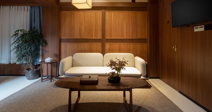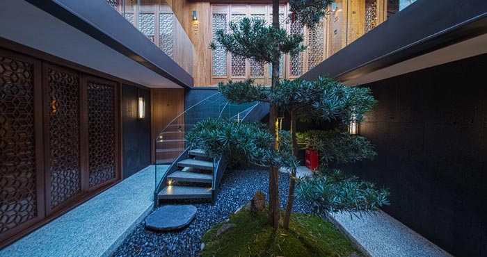 本次為民宅民宿設計項目,在設計中保留原建筑的柱網(wǎng)空間,同時以院落為中心,將空間劃分為四個客房區(qū)域,整體呈現(xiàn)中軸對稱的格局。