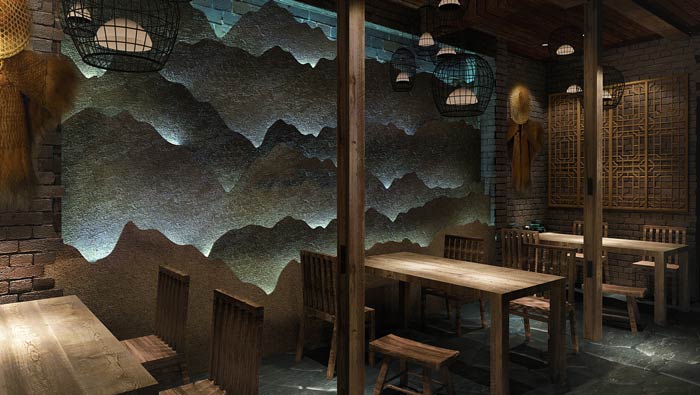 特色燒烤店墻畫設(shè)計(jì):墻畫是以山水畫為背景,這樣做是為了將自然很好的融入室內(nèi),山巒起伏讓客戶仿佛置身于小村莊一樣,讓客戶享受到不一樣的生活方式。