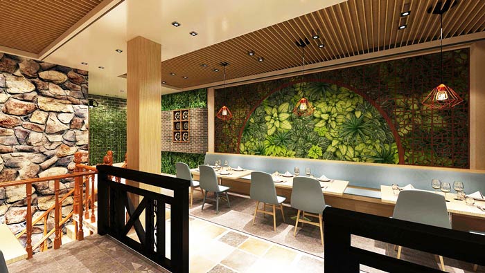中式快餐店二樓餐區(qū)設(shè)計:二樓餐區(qū)主要以4人桌、6人桌構(gòu)成,餐桌與餐桌之前可以拼湊,這樣既能滿足常規(guī)的需求,同時也能滿足非常規(guī)的需求,二樓的景色以綠色為主。