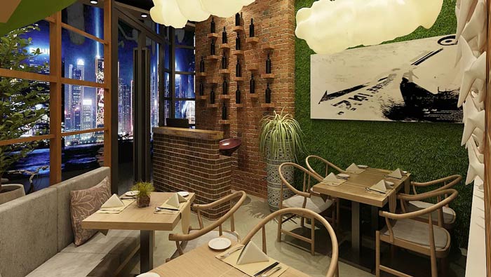 特色面館餐區(qū)裝修設(shè)計:這里有魚兒、鹿等動物,有綠植、綠色植物墻等植物,還有云狀的燈光,三者相連構(gòu)成一個動靜結(jié)合的空間,在這里整個空間宛若自成一體。