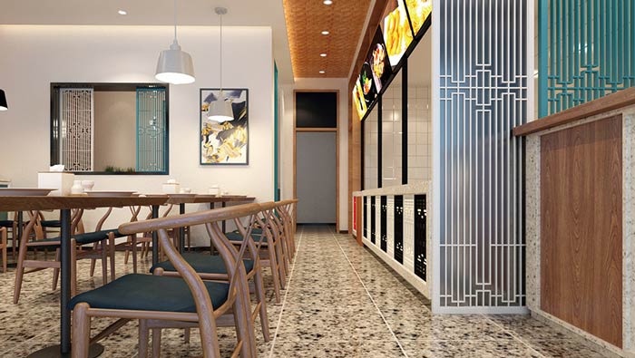 燜面館進(jìn)門(mén)區(qū)裝修設(shè)計(jì):客戶進(jìn)入空間后,首先看到的就是面館干凈、舒適的環(huán)境,這樣設(shè)計(jì)是希望通過(guò)環(huán)境留下客戶,客戶徑直走到上菜區(qū),兼顧了實(shí)用與環(huán)境的雙重標(biāo)準(zhǔn)。