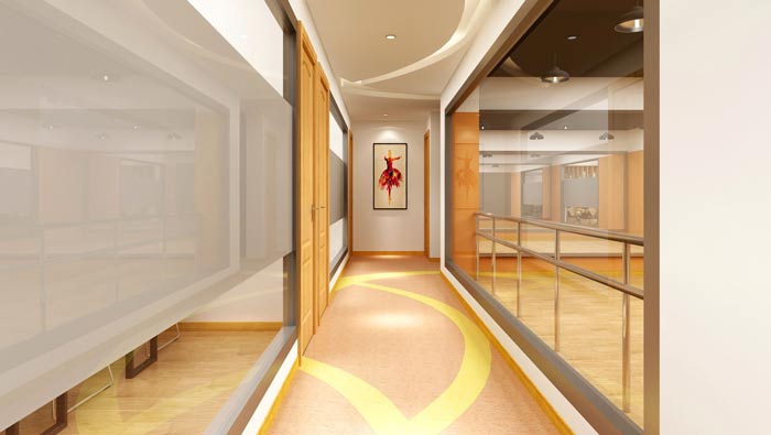 舞蹈培訓(xùn)機(jī)構(gòu)二樓過道設(shè)計(jì):二樓主要以舞蹈培訓(xùn)為主,過道地面地板膠和頂面造型設(shè)計(jì)相互呼應(yīng),這樣的設(shè)計(jì)既能保證空間的靈動(dòng),同時(shí)又能折射出一種孩童對(duì)未來的幻想。