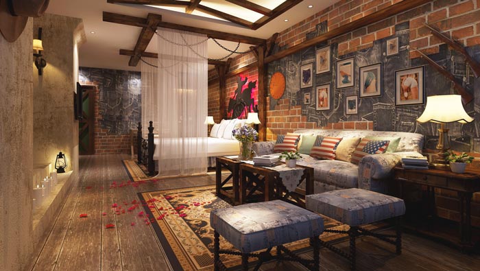 客房的設(shè)計(jì):此處給人一種鄉(xiāng)村與家的感覺,這是因?yàn)樵O(shè)計(jì)師融合了鄉(xiāng)村的氣質(zhì)與家的溫馨,設(shè)計(jì)師希望讓戀人在這里體會(huì)到異地他鄉(xiāng)的鄉(xiāng)情,在這里流露更多的對(duì)未來的期許,在這里戀人仿佛看到了美好的未來,對(duì)于未來也有了很好的憧憬,讓彼此攜手前行。