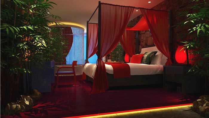曠古奇緣客房的設(shè)計(jì):相信每一個(gè)人都有一個(gè)穿越的夢(mèng)想,都想穿越到過(guò)去用自己的本事,建造一份功業(yè)并遇到自己的紅顏知己,戀人們進(jìn)入空間之后,就仿佛與現(xiàn)世脫離,穿越到了五百年前,在這里設(shè)計(jì)師希望戀人們可以真切的體驗(yàn)一次古代的愛(ài)情,讓彼此之間的感情可以更上一層樓。
