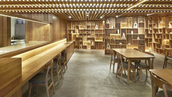 日式餐廳吧臺(tái)設(shè)計(jì):吧臺(tái)可以清晰的看到廚師的一舉一動(dòng),從這一點(diǎn)也可以看出餐廳的信心,廚師從開始做到端上來(lái),每一個(gè)細(xì)節(jié)都躲不過客戶的眼睛,讓客戶參與其中。